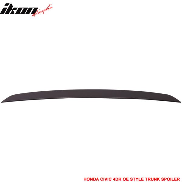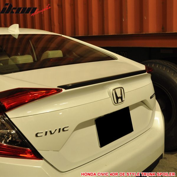 • OE/OEM Part Number: 2016 2017 2018 2019 2020 2021 Honda Civic Turbo Plus EX-L EX DX, EX-T LX SE Si Touring i-Style Sport Sedan 4-Door 4Dr, Unpainted Black ABS Plastic OEM Factory Style, Trunk Boot Spoiler Decklid Wing, Easy Installation, No Drilling Required