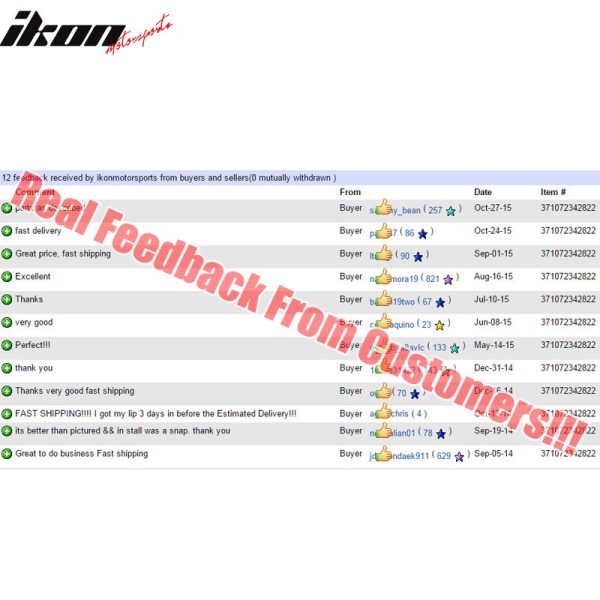 Document PRODUCT DISPLAY PRODUCT DESCRIPTION FEATURES & BENEFITS OTHER OPTIONS CONTACT US Key Features & Benefits 1. Custom & Direct Fit: This item is the whole set of 100% brand new custom fit front bumper lip spoiler, precisely engineered for an exact fit to your vehicle. Please confirm the compatibility before purchasing the front bumper body kit. 2. Premium & Reliable Material: The new designed front bumper lip chin spoiler is made of updated durable and sturdy materials to protect your car from scrapes caused by curbs or collision. The front lip splitter is constructed and tested by strict quality control standards with high impact resistance, heat resistance, corrosion resistance. 3. Effective Protection & Exquisite Appearance: Daily driving can provide anti-collision protective experience to your original air dam chin front bumper lip, protect from scrapes from driveways, speed bumps and curbs, alleviate the damage. In addition, it will dramatically improve the sporty and aggressive appearance for your car. 4. Aerodynamic Performance: The automotive vehicle front bumper spoiler improves aerodynamic characteristics by enhancing the transition between the high speed airflow under the vehicle and the free airflow in the surrounding, thus ensuring better performance and fuel economy. 5. Easy Installation & Available Painting: The car front lip spoiler splitter is designed for easy installation and comes ready to prep and paint.. Of course, professional paint job and installation is highly recommended. If you are not sure whether your car is suitable or how to install it, please contact us timely, we will help you solve the problem. Specifications Bumper lips are custom fit to transform your vehicle's front end for a dramatic effect and adds a finished look to street, custom and off-road vehicles. Bumper lips mounts easily over existing bumper.100% brand newFitment:Fits 2002-2004 Nissan Altima All ModelsPU – Polyurethane PU – PolyurethaneColor:HIGH QUALITY POLY-URETHANE MATERIALKit includes: NIS StyleBumper lip will only fit on original factory bumper.Enhance the appearance of your car.Super light weight.Instruction is not included.Note: If in any case the lip became warped, simply lay it on a flat surface under the sun or use a heat gun gently heat up the warped area. The poly urethane material will restore back to its original shape when heated and stays that way after it cools down. Descriptions The Front Bumper Lip Spoiler Splitter is not just a piece of decoration for your car. It serves quite a few additional functions other than adding to the car's aggressive and personalized appearance. It can protect your vehicle from minor damage and preserve its paint. The bumper lip splitter can provide better aerodynamic performance, reduce airflow, and then decrease air drag, and in crease fuel efficiency. It can also increase the stability of the vehicle while driving at an extremely high speed. In conclusion, the front bumper lip air dam chin is a helpful accessory to reduce the airflow and protect the car from damage, and also a stylish and fancy decoration. We provide a wide range of front bumper lip, spoiler and splitter kits that combine high quality and unique, stylish designs. Now, it's time to find one that fits your vehicle best. Welcome to IKON MOTORSPORTS Store. Custom Designed For Perfect Fit IKON MOTORSPORTS each front bumper lip spoiler is measured to direct fit your car model perfectly. The Detailed Functions Of The Bumper Lip CAR BUMPER PROTECTION LIP can help you solve these problems. Protect the Bumper From Damage A bumper lip covers the bottom edge of the bumper on the vehicle, protecting it from potential scrapes and nicks on a speed bump, parking block, curb, etc. It's also an excellent helper to preserve the paint of the car. Reduce Airflow Under the Vehicle When driving, there's air flowing under the vehicle. It will slow the car down and cause a loss in speed. The bumper lip can improve your car's aerodynamics and reduce airflow, and then decrease air drag, and increase fuel efficiency. To some extent, this can also help increase downforce, which improves handling. Enhance the Vehicle's Overall Look Some people install a front bumper lip just to make the car lower in appearance. The car with a lowered look is more stylish and attractive. So, it's also a great addition to improve the vehicle's aesthetics. Before VS After Installation Installing a front bumper lip spoiler splitter, it serves quite a few additional functions other than adding to the car's looks. It can protect your vehicle from minor damage and even aid its aerodynamics. Available Front Bumper Lip Universal Front Bumper Lip 1PCS Front Bumper Lip 2PCS Front Bumper Lip 3PCS Front Bumper Lip 4PCS Front Bumper Lip Add to Cart Add to Cart Add to Cart Add to Cart Add to Cart Our front bumper lips have the following options Click and turn to the related items Available Color Unpainted Matte Black Gloss Black Carbon Fiber Print OEM Painted Color Available Material CF – Carbon Fiber Matte Carbon Fiber PP – Polypropylene PU – Polyurethane ABS – Acrylonitrile Butadiene Styrene Available Style OE Style Mugen Style Type R Style AC-S/A Style Performance Style Domestic 48 States Free Shipping HI, AK, PR, GU, VI, APO, FPO 66 Canada 66 International 132 CA Sales Tax 10.75% Shipping Carrie UPS Ground, FedEx and USPS Priority, Pilot (Truck) for Large Package All Packages Will Be Shipped Out From Our CA Or GA Warehouse. We Will Adjust The Shipping Location On The Basis Of The Item Current Stock And Your Order Delivery Address. Please Feel Free To Place Your Order! Payment Methods Warranty 30 Days Money Back It is our goal to provide 100% satisfaction and peace of mind to our customers. If you are not satisfied with the products for any reason within 30 days of receiving the item. We will charge 25% restocking fees on returned items that have been installed, damaged, painted, cut and not authorized, etc. Plea